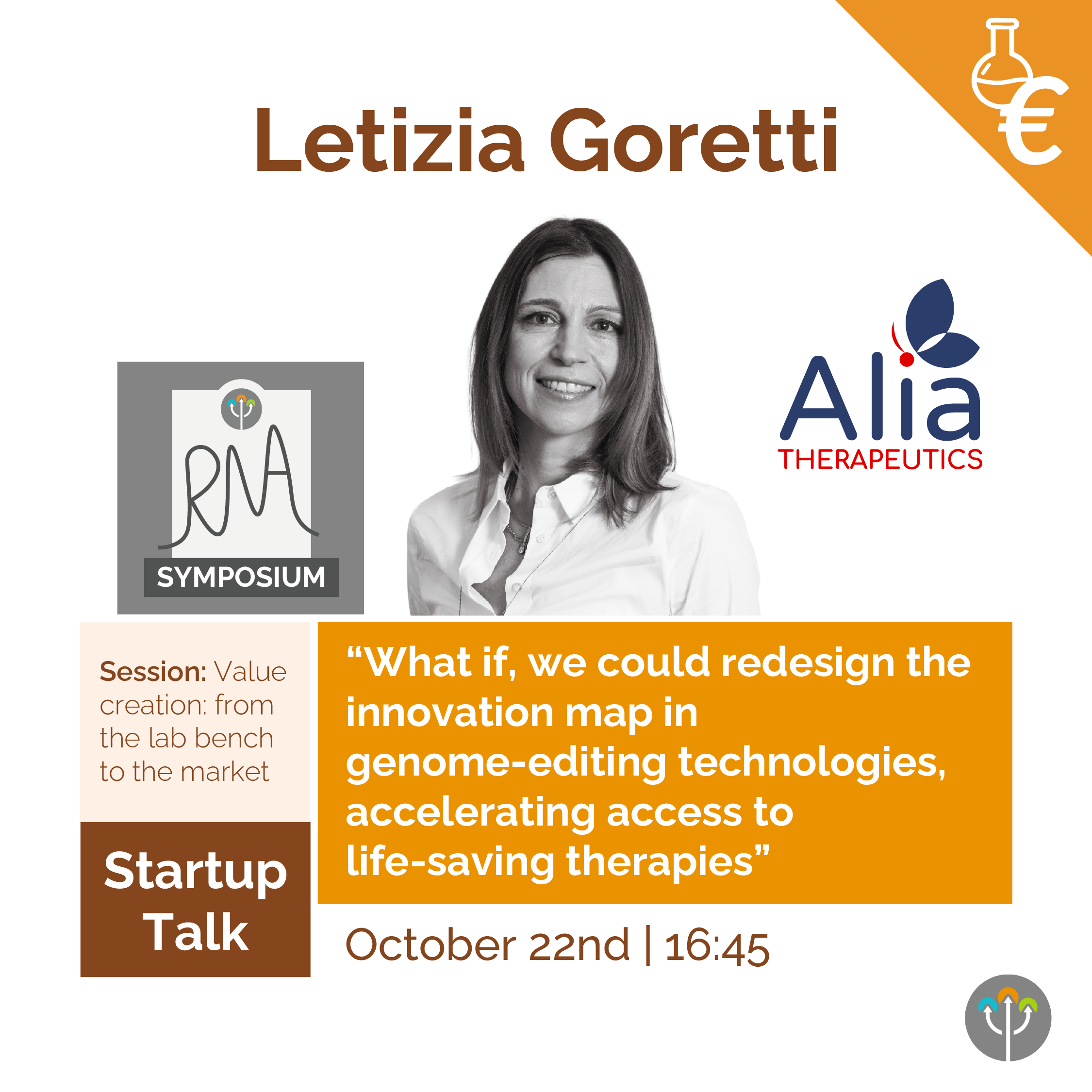 Letizia Goretti is the CEO of Alia Therapeutics, a Trento-based biotech startup committed to curing genetic diseases. Founded by Professor Anna Cereseto and her team at the University of Trento, Alia is advancing genome editing technologies that expand the range of treatable genetic targets and deliver unprecedented precision and safety essential for next-generation therapeutic applications.